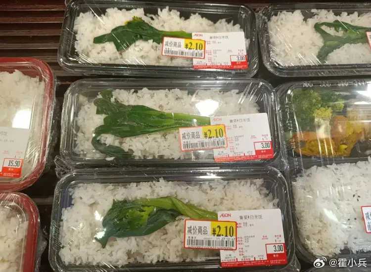 @霍小兵: 发帖人在永旺超市里看到了一种盒饭:一整盒大米饭上铺着一根孤零零的青菜,没有其他任何配菜。原价 3 块钱,到点还会打折,只要 2.1 元就能买回家。