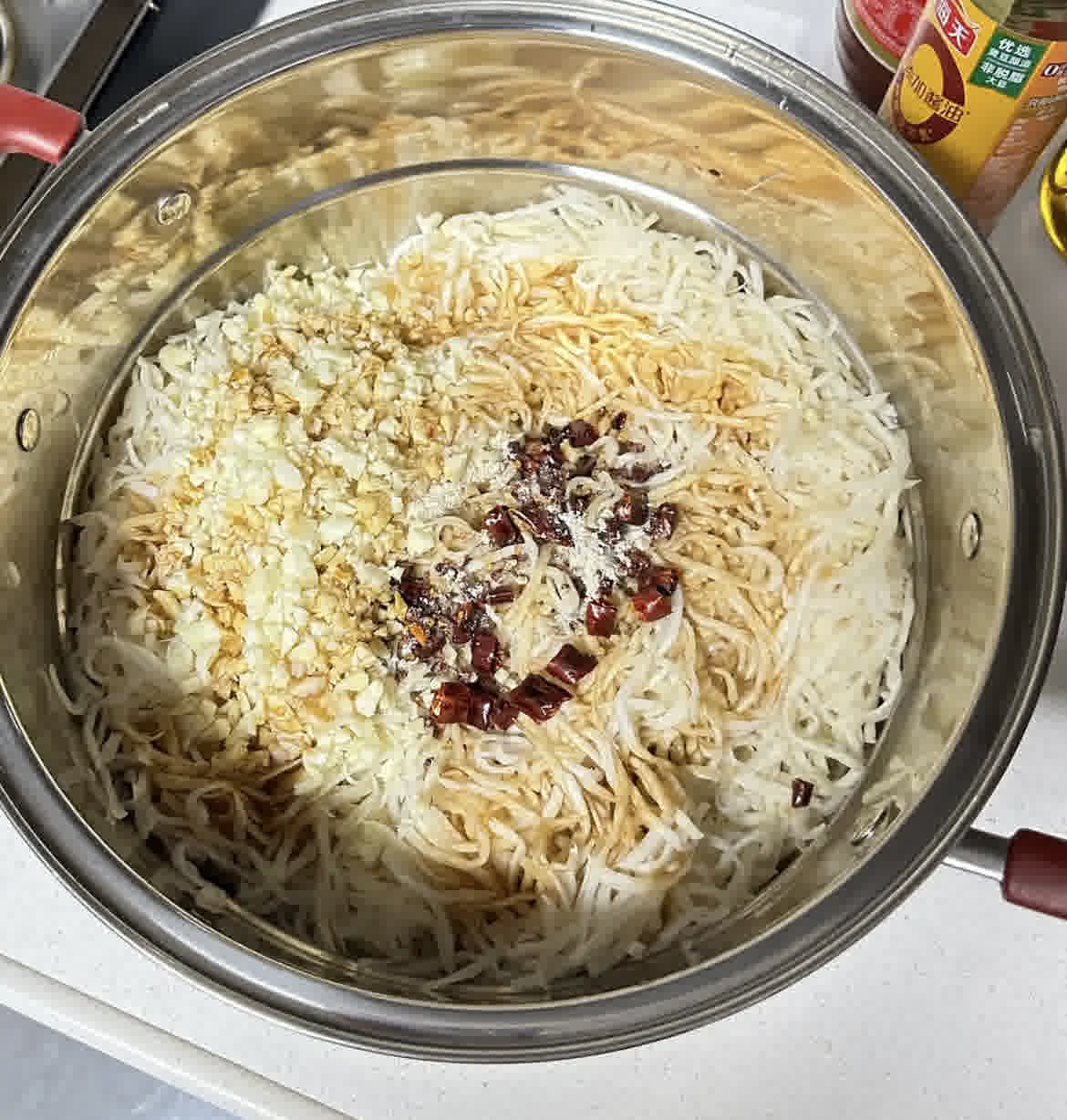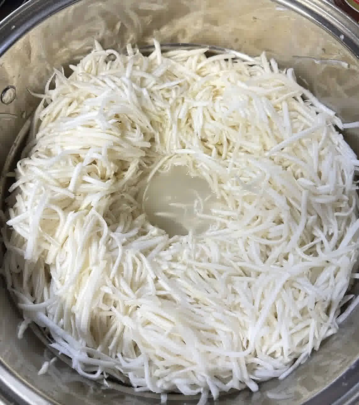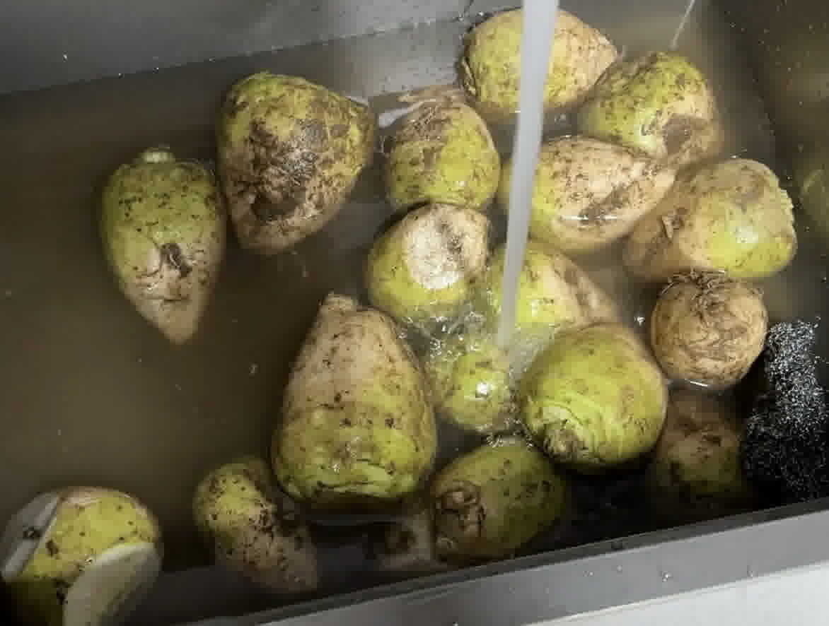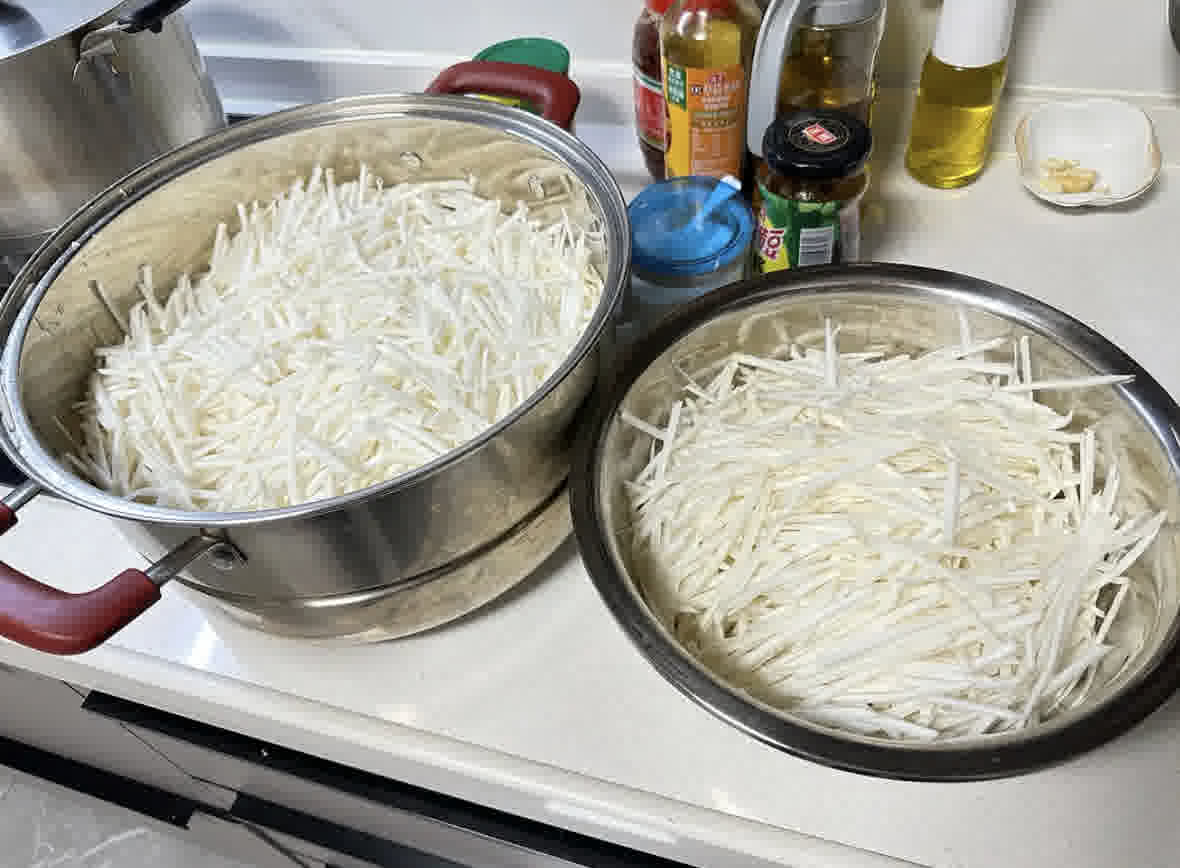 9 斤芥菜头加入 350g 食用盐杀水一晚 然后挤干净水分 我用了纱布裹起来挤