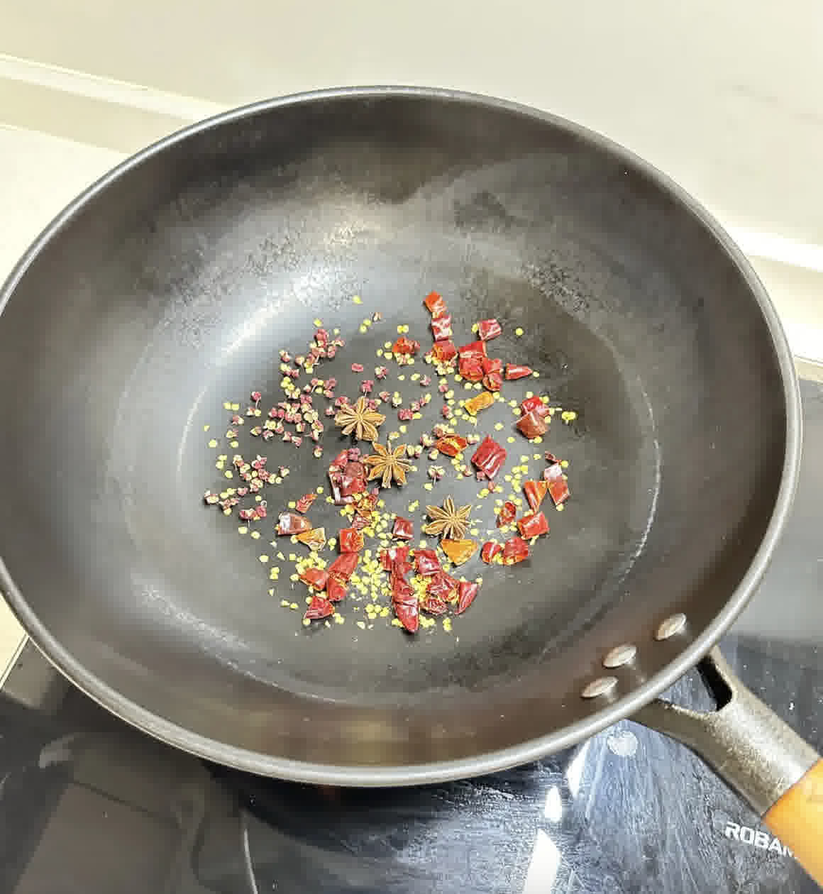 花椒 辣椒段 八角炒香(不加油)多加一点 我又加了第二次