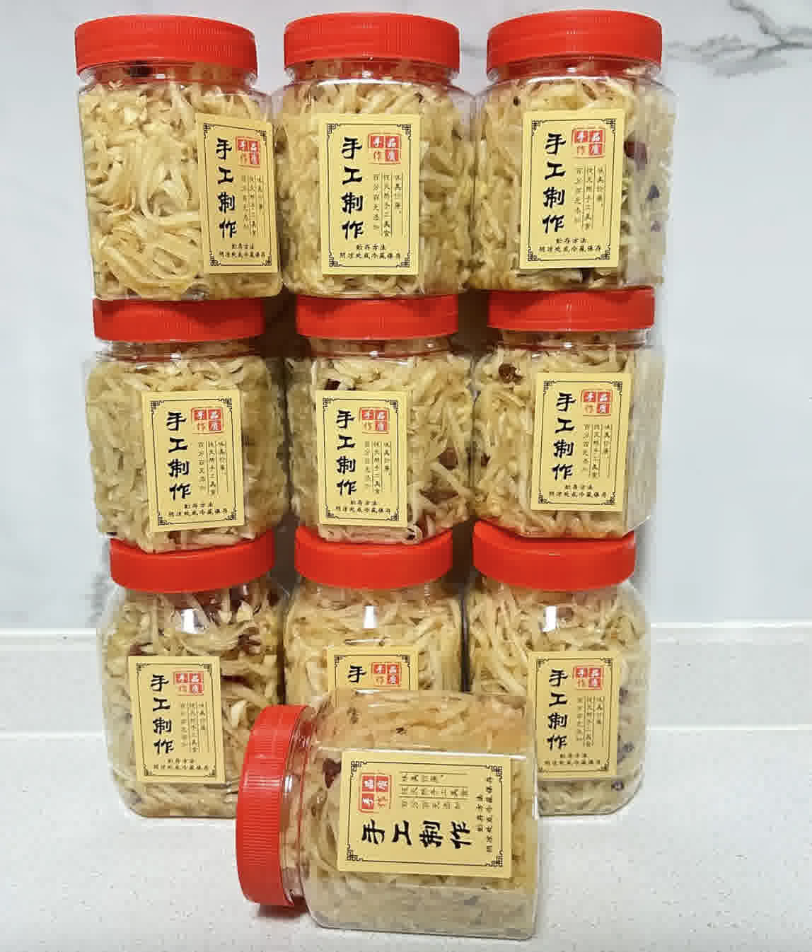 400g 蒜末 两勺味精 20ml 白醋 50g 白糖 50ml 生抽调味抓匀然后调出大料丢掉 装罐