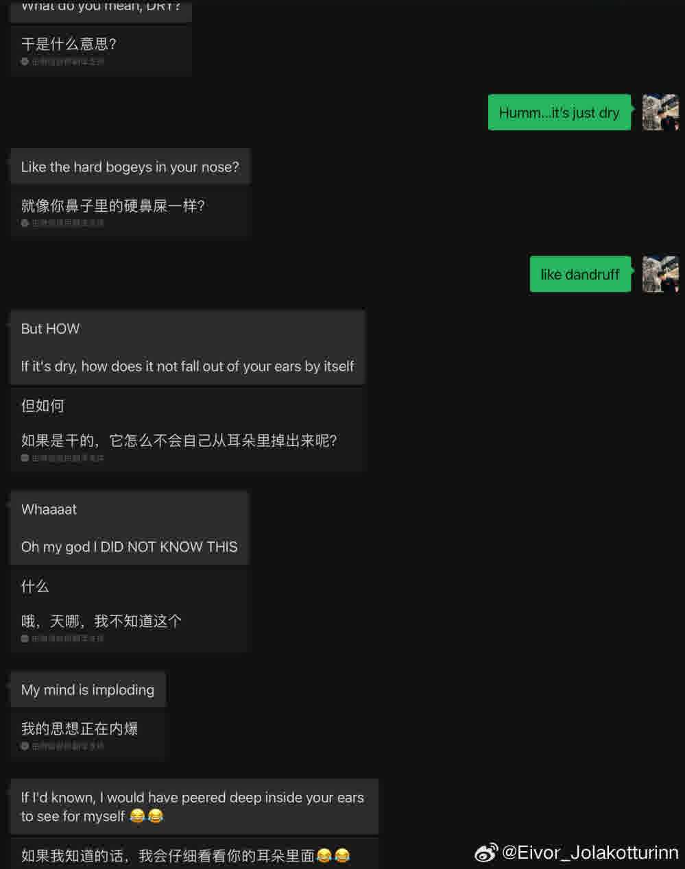 我朋友得知很多中国人的耳垢是干的,以及我们用的清除耳垢的工具叫 “挖耳勺” 后,他震惊的不得了,说早知道应该揪着我的耳朵看看。这就和我当年被一堆白人男同学体育课后围着闻,然后惊讶地说我身上不会有味道是一样的感受