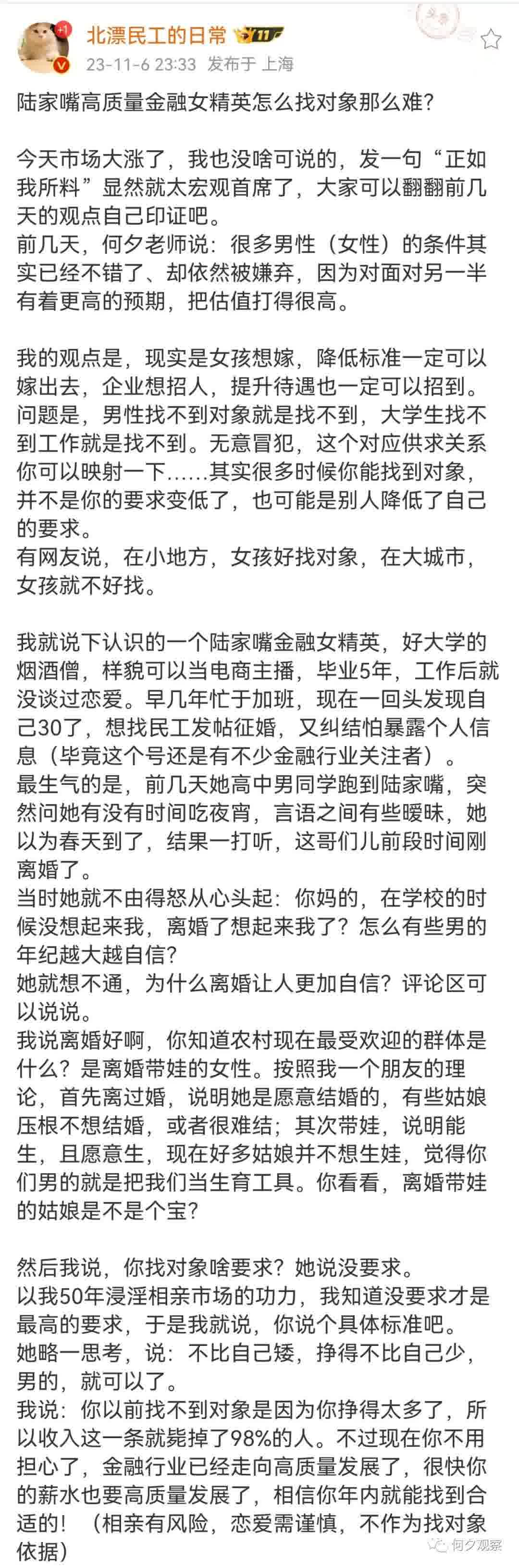 本话题来源于 @北漂民工的日常 老师的一则微博:陆家嘴高质量金融女精英怎么找对象那么难?