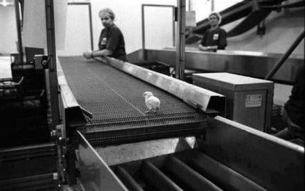在网上流传这样一幅图片,一只小鸡站在一条传送带上,不远处两个女工,望着小鸡。画面平淡无奇,但配上文字,画面就极具震撼。残酷的事实是,由于雄性小鸡不下蛋,长得也慢,所以,一旦孵化出来后,所有的小鸡都要在流水线上经过人工挑选,被挑选出来的雄性小鸡就会被放在传送带上直接送到机器中碾碎,然后做成饲料或者其他蛋白质产品。