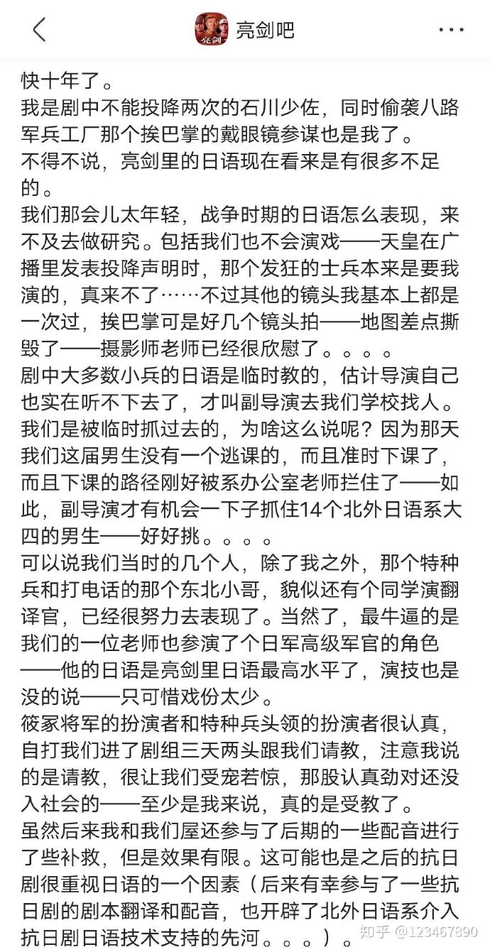 至于演员的日语,05年那个时候,多数剧里的日本人只会说个"嗨""八嘎""哟西",我印象里没有抗日剧让演员从头到尾说日语,所以亮剑里演日本人的演员,要通篇背不是母语的台词,也很辛苦。在亮剑吧找了个关于亮剑日语的帖子,帖子里提到的老师应该是亮剑第一集宫野的演员,就是喝茶下围棋的那位。