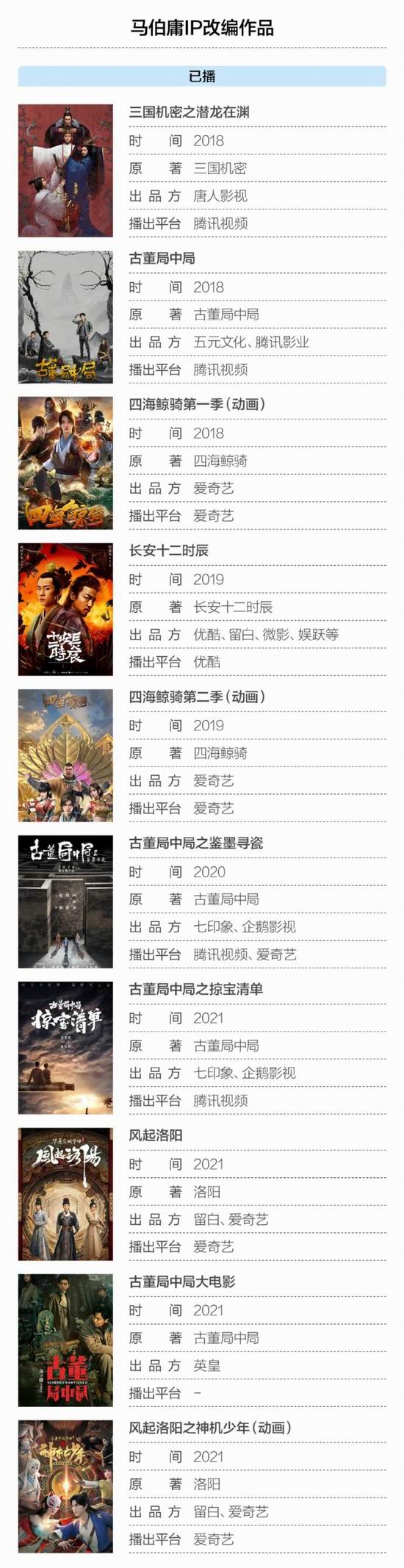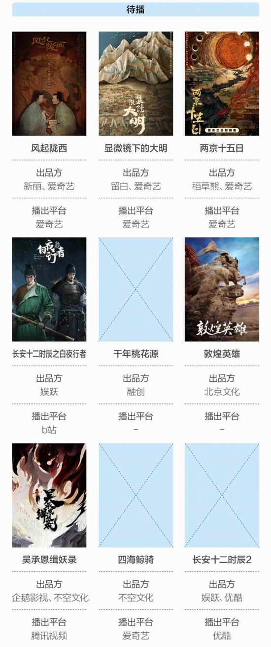 爱奇艺目前总共有十余部马伯庸作品.IP.待开发,合作者包括稻草熊、新丽传媒、七印象等。腾讯视频在之前已经上线过《古董局中局》三部曲,之后还储备了两部网剧和一部动画剧集。优酷正在筹备《长安十二时辰.2》,B.站则聚焦在动画剧集层面,依托《长安十二时辰》,规划了动画片《长安十二时辰之白夜行者》。今年.5.月,融创文化宣布将与马伯庸合作开发."千年桃花源".IP,进行动画番剧、真人剧集和动画电影的开发,并有望实现实景落地。