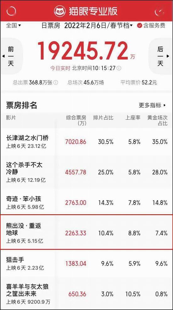 比起隔壁喜羊羊,《熊出没?重返地球》在小孩子间还更受欢迎一些,但这俩兄弟在春节档几乎是难兄难弟,谁也没比谁好