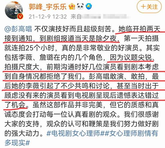 制片人透露很多人不敢演这个角色,但她是在开拍前两天才接到通知来演这个角色的,为了贴近角色几乎三天三夜不吃不喝,除夕夜拍了.25.个小时,说明彭高唱本身是个勇于尝试各种角色,能抓住机会又刻苦的人。