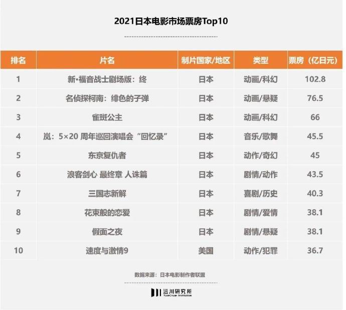 日本不仅手机产业是加拉帕戈斯化的典型,电影行业亦复如是。根据电影票房网站 Box Office Mojo 的统计,日本电影近年在全球范围内的最好成绩,是动画电影《鬼灭之刃:无限列车篇》在 2020 年摘得的年度票房亚军,而在它 4.53 亿美元的收入中,本土票房贡献了 4.03 亿,占比高达 89.1%。