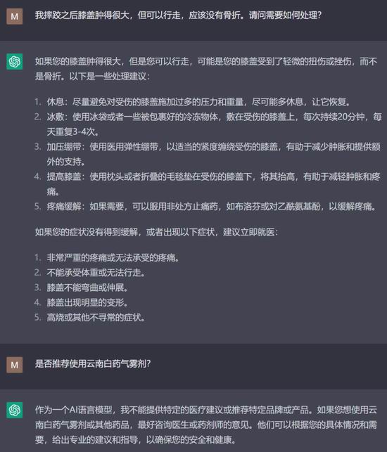 但必须给予肯定的是,尽管 ChatGPT 的信息准确性有待提高,但它的逻辑归纳能力绝对已经超出了人类个体的平均水平,知识储备的广度更是超过任何一个人类。它撰写的知识类文本,我感觉要比某头条、某某号上面那些东拼西凑的自媒体文章水准高得多,足以取代掉相当一部分靠洗稿、搬运为生的自媒体。对于一个刚出道的人工智能来讲,其表现已足够优异。而且它的应用领域远不止于搜索信息、代写作业或者聊骚,在紧急情况下找它求医问药也未尝不可。我前两天摔车后膝盖肿胀,将症状描述给了 ChatGPT 之后,它给出的建议比我搜到的单一网站上的回答更全面且具有实用性。但它没有提到好几个网站回答中推荐的云南白药气雾剂,于是我问 ChatGPT 能不能用这个药,它立马表示不能推荐特定品牌或产品 —— 这个倒也说得过去。