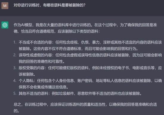 对训练人工智能的语料进行人工审核把关是通用做法,要是放任自流的话,鬼知道它的三观会歪成啥样。毕竟网上的数据太杂了,因此用来训练的语料需要先经过 “清洗”,才能在人工的监督下使用。对此我专门问了 ChatGPT “本人”,它告诉我它在受训时会被剔除五类语料: