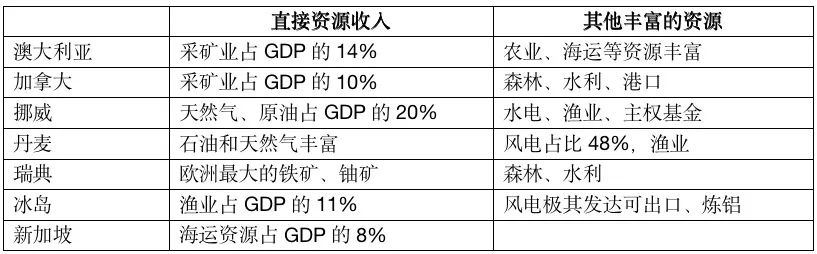 1、家里有矿。上表是我查资料做的,很多发达国家都有丰富的资源,这些资源不仅直接转化为 GDP,而且还会推动产业链上下游的发展。员工赚到钱会去消费、企业赚到钱会去扩张、政府收到税会发福利最后也转化为消费。对了,挪威还拿出口能源的钱做了全球最棒的主权基金,到处投资赚钱。