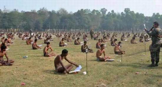 考生作弊作得太狠,以至于在.2016.年的一次征兵考试中,考官不得不让.1159.名考生脱光衣服,穿着内裤在空旷的大草地上答题。