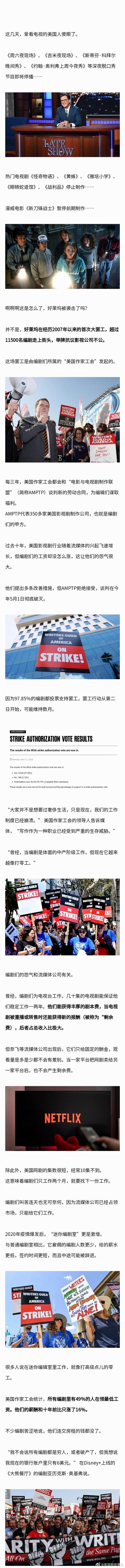 @英国那些事儿: 美国编剧大罢工!为了抗议薪资不公和限制 AI,超过 11000 名编剧罢工,给好莱坞按下暂停键…… 大量脱口秀、电视剧、网剧受到影响,已经停播……