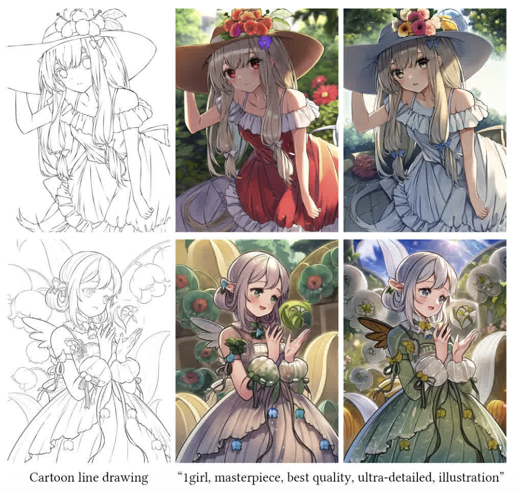 用 ControlNet 控制模型给手绘线稿上色。来源:ControlNet 的 GitHub 页面
