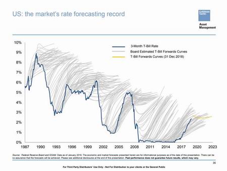 最近看到一篇投资圈的报道,统计了高盛从 1987 年到 2023 年预测利率的准确性。搞预测,高盛是专业的,毕竟只要能准 10%,高盛就能赚十几亿美元。收益是第一驱动力。结果,看这张图。