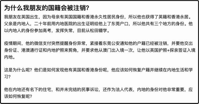 起因是在知乎看到一个主题,为什么我朋友的国籍被注销了。一般看到这种句式,默认就是无中生友,这么私密的事一般也不会有朋友到网上问东问西,看破不说破罢了。
