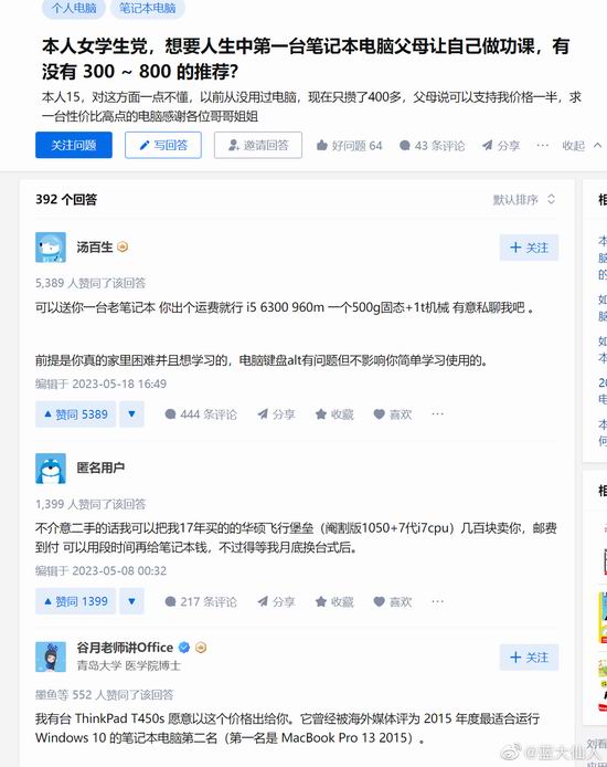 @蓝大仙人: 知乎上提问,女孩子想买笔记本电脑,预算 300-800 元,本以为会被嘲笑,没想到排名前五的回答都是想帮她解决问题的