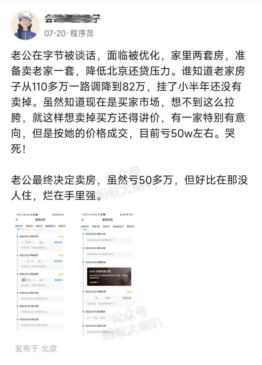 一位网友发帖称:自己的老公在字节工作,面临被优化,家里有两套房,准备卖老家一套,降低北京还贷压力。谁知道老家房子从 110 多万一路调降到 82 万,依然无人问津。虽然知道现在是买家市场,但是跟想象中差距太大了,就这想卖掉买方还得讲价,有一家特别有意向,但是按她的价格成绩,目前亏 50w 左右。哭死!老公最终决定卖房,虽然亏 50 多万,但好比在那没人住,烂在手里强。