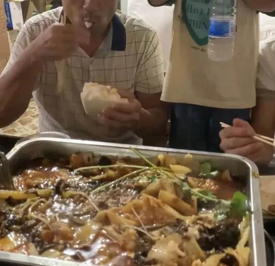 但老一辈却一直在推辞自己不吃,光拿着白馒头啃得起劲。