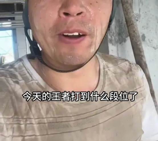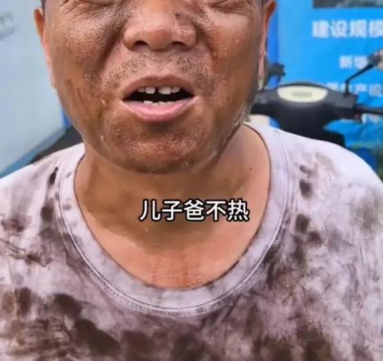爸爸穿着民工服、满脸全都是干活留下的污渍,一边抹着汗一边对着镜头说: