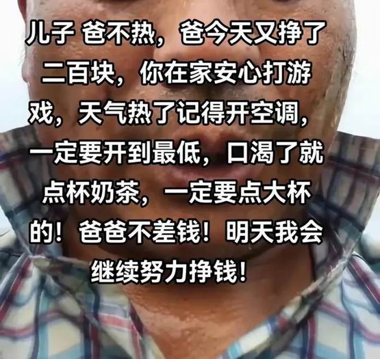 “儿子,爸不热,爸今天又挣了200块钱,你在家安心打游戏,口渴了就点杯奶茶,一定要点大杯的!”