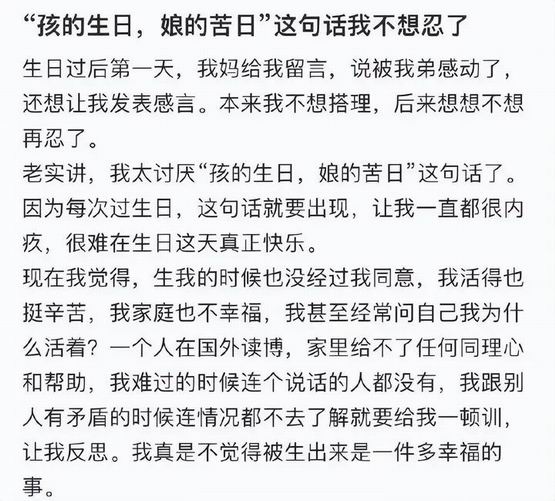 女儿实在受不了,直接对妈妈摊牌自己非常不喜欢这句话:“生我也没经过我同意,我活着也遭了不少罪。”
