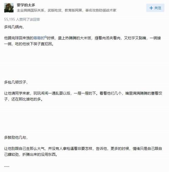 “多炖几锅肉。他踢完球回来饿得嗷嗷叫的时候,盛上热腾腾的大米饭。