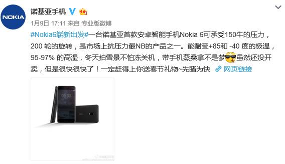 一台诺基亚首款安卓智能手机Nokia 6可承受150牛的压力,200 轮的旋转,是市场上抗压力最NB的产品之一。能耐受+85和 -40 度的极温,95-97% 的高湿,冬天拍雪景不怕冻关机,带手机蒸桑拿不是梦。