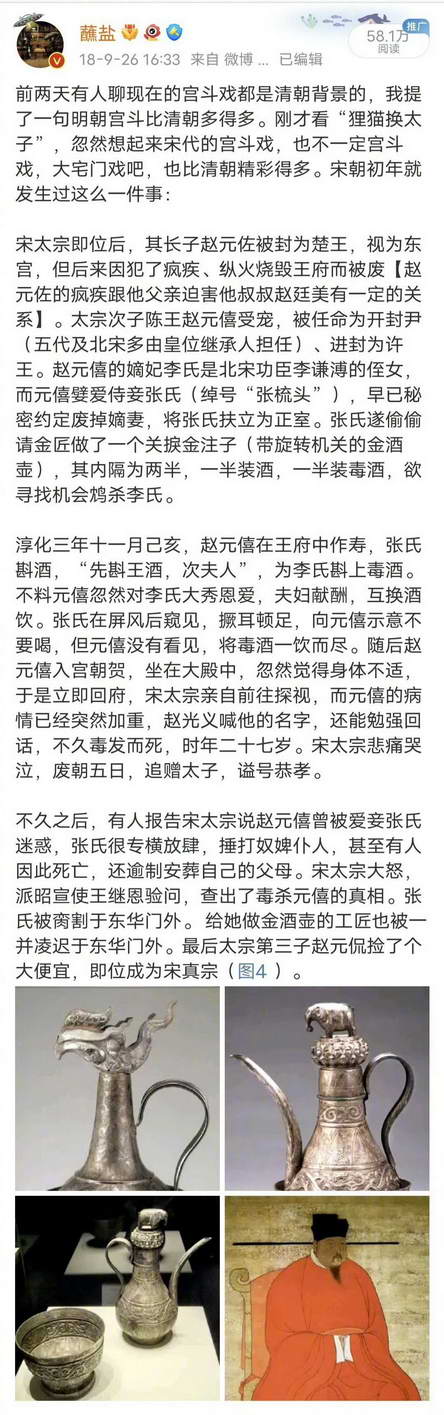 回到皇家,宋太宗不愧是武将出身,西直门车神,一口气生了 9 个儿子,而且老大非常出息,被他爹寄予厚望。正常剧本是立老大为太子吧?结果剧本走向突然变了,老大因为反对父亲迫害自己的几位叔叔,跟父亲吵架,当然没吵赢,然后就得了 “心疾”,精神出问题了,到后期甚至放火烧宫,这自然没法继承皇位了。