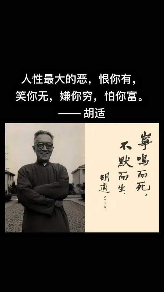 我说——胡适对新文化运动,还是有贡献的,表面上看,胡适的一生,也没有大的罪过,但是,胡适这种人的危害却太大了。长远来看,胡适所代表的虚幻虚无主义,比起汪精卫这种真真正正的汉奸,对中国的危害,更全面,更持久,也致命。