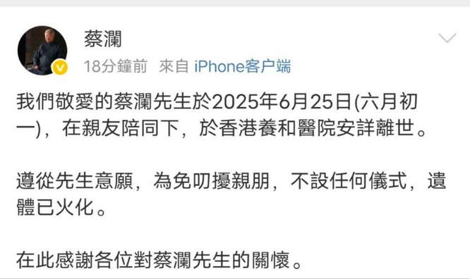 83 岁的蔡澜,微博日常分享停在 3 月,抖音停在 2 月,小红书已久未更新。