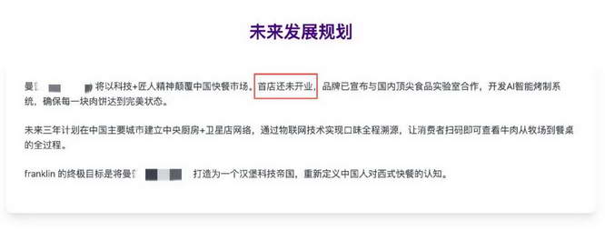 后续我们找到该汉堡品牌如同 AI 生成的官网主页,网站基本获取不到有效信息。所谓的主厨也不知道是否确有其人。未来规划写着 “首店还未开业”,但已经 “开发 AI 智能烤制系统”。