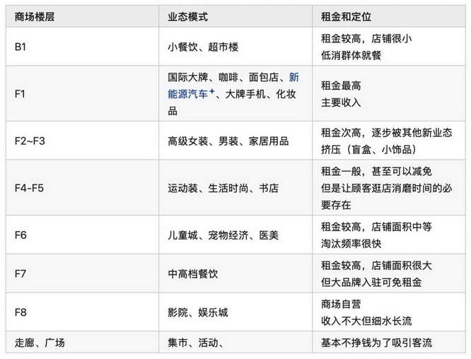 1. 租金模式:商场按面积收租,高奢店虽大但租金单价低,真正赚钱的是地下一层小铺位和餐饮店;