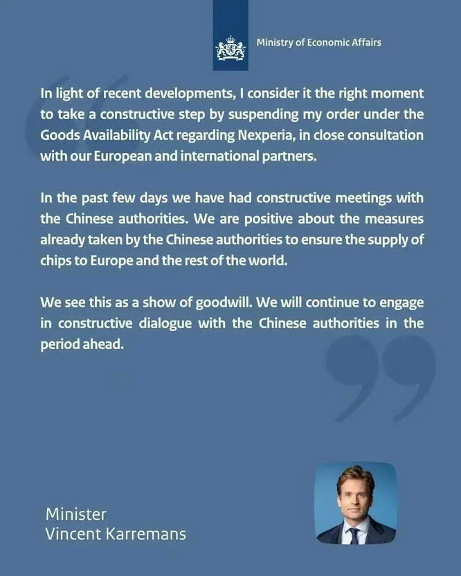 这场重要磋商最终于 18 日和 19 日在北京进行。随后,荷兰经济事务部官网发布公告,部长卡瑞曼斯(Vincent Karremans)宣布,暂停此前针对安世半导体的相关干预措施。据环球网报道,其在社交媒体 X 上发声明表示。“鉴于近期的事态发展,我认为现在是采取建设性步骤的正确时机。”