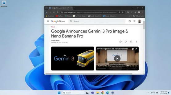 帮我生成一张 Windows 11 的电脑截屏,桌面和背景一切正常,屏幕中间打开了一个 Chrome 浏览器,上面正在播放 谷歌发布了 gemini 3 的新闻,左下角的时间是 2025 年 11 月 18 日