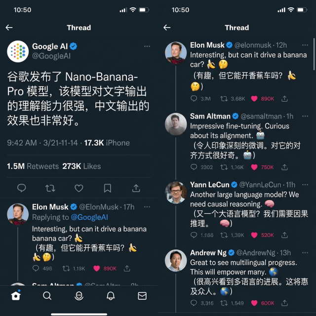 帮我生成一张推特互动流截图(竖图),内容是为谷歌发布的推文:“谷歌发布了 Nano-Banana- Pro 模型,该模型对文字输出的理解能力很强,中文输出的效果也非常好。” 点赞,参与评论的人有 马斯克,山姆奥特曼,等一系列的 AI 领域大佬,大家讨论的内容是英文,但是被翻译成了中文一起显示,每条信息的互动量都很高。