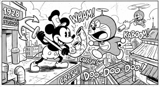 就比如这儿,我让它来生成一张米老鼠大战多啦 A 梦的漫画。