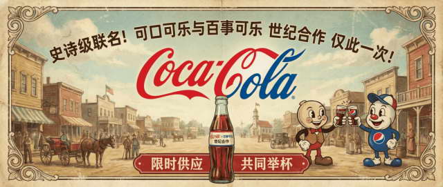 制作一张可口可乐和百事可乐联名宣传产品的横幅海报,要求用中文,整个海报要有复古元素