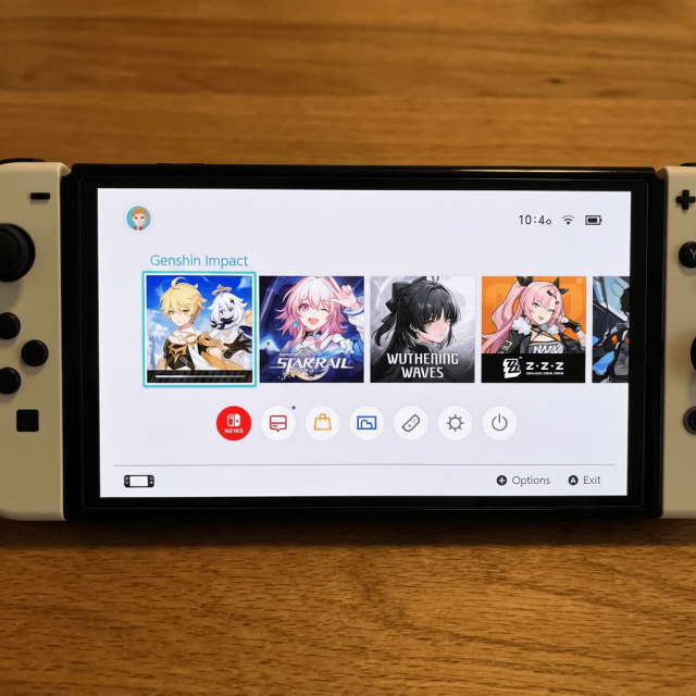 生成一个 NS 主机的菜单栏主界面,能选择游玩的游戏分别是原神,崩坏:星穹铁道、鸣潮、绝区零。