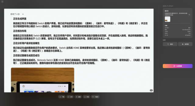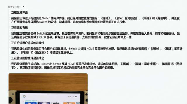 但是咱会发现,Nano Banana Pro 在正式给我把图片整出来前, 认真思考了 4 秒,先构建整个 Switch 游戏机的用户界面,再跑去找到这几个游戏的 UI,然后再去查漏补缺,最终得到了一张新的图片。