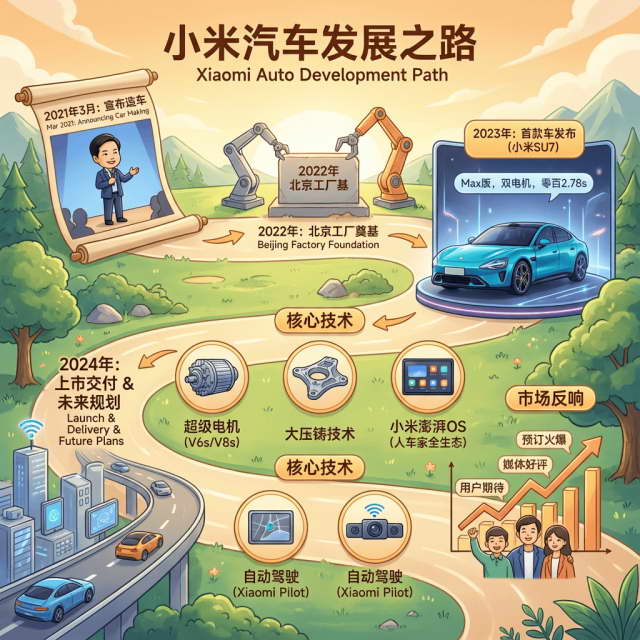 生成一张图文并茂的美丽图片,介绍一下小米汽车的发展之路