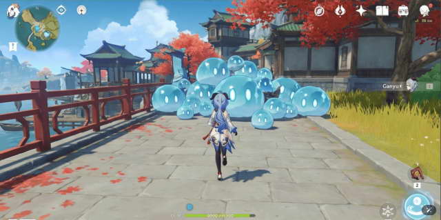 一张原神的游戏截图,在璃月的城市边上,玩的角色是甘雨在赶路,前面出现了 15 个冰属性的史莱姆。