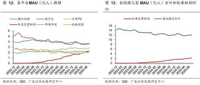 从用户数据来看,除了主打综艺的芒果之外,其他长视频平台均在下滑。广发证券研报显示,从月活跃用户来看,25 年 7 月,爱优腾芒四家长视频平台 MAU 合计为 12.10 亿,同比下滑 4%;红果短剧达到 2.3 亿,同比增长 179%。