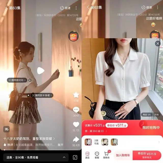 以《十八岁太奶奶驾到,重整家庭荣耀》为例,观看短剧时会出现 “搜同款衬衫”、“搜同款半身裙” 等提示,点击即可跳转到商品页面完成购买,无需任何跳转操作,在红果站内完成闭环交易。有媒体报道,《好一个乖乖女》《家里家外》等剧通过服饰、首饰带货,单剧 GMV 超 500 万元。