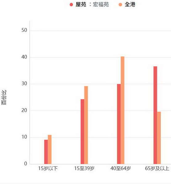可以发现,全香港 65 岁以上人口不到 20%,但宏福苑的长者人数比例已经达到了 37%,其中女性长者更多。