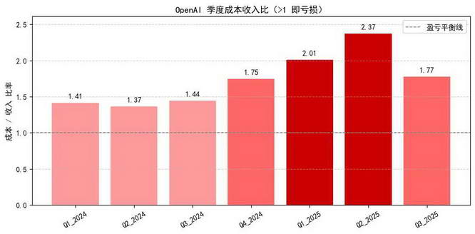 即使到了 2025 年第三季度,成本 / 收入比略有回落至 1.77,但仍远高于盈亏平衡线(1.0),且仍高于 2024 年任何单季水平。