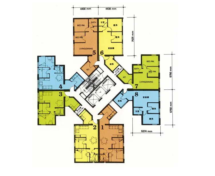 同一楼层围绕中央楼梯和电梯井,会布置八个独立住宅单元。这意味着,可以容纳八个家庭的入住。香港人把这种房型,叫做八面来风。