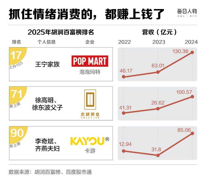 当房地产富豪从财富榜上成批消失,靠 “情绪” 挣钱的新贵们已经坐上了牌桌 —— 泡泡玛特、老铺黄金、卡游。这些曾被主流资本拒之门外的生意,正靠着为年轻人提供丰沛的情绪价值,划出了收入与利润陡峭的增长曲线,并将它们的创始人一举推上财富榜。