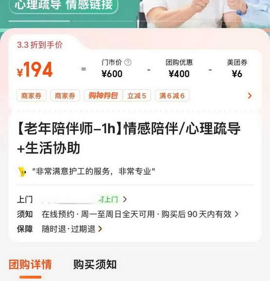 在团购平台上,深圳一家陪护机构挂出了 “老年陪伴师” 服务,服务内容包含情感陪伴、心理疏导、生活协助等。客服人员跟我分享了两个过往的服务案例,一个是陪老人逛街,一个是陪伴认知能力退化的老人,陪伴师通过互动和小游戏,帮助老人做认知上的康复训练。