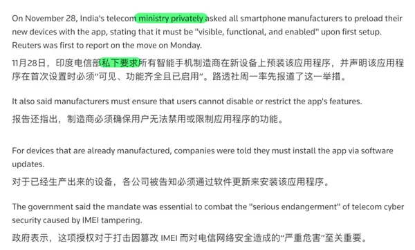 先说社会影响的部分,路透社在报道这件事的时候提到了,印度电信部是私下要求手机厂商们去预装该应用程序的。